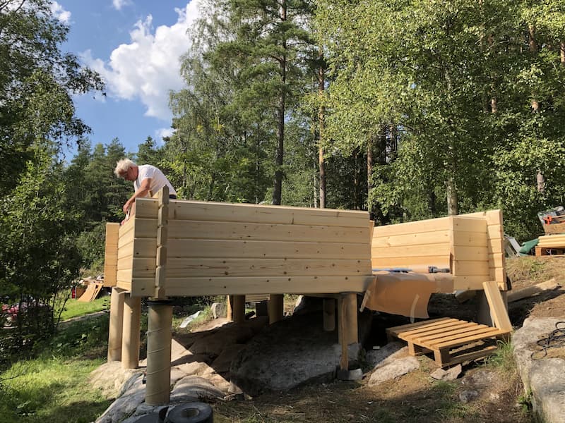 Här har Lars monterat ihop friggeboden och påbörjat arbetet att montera sin egendesignade altan och får till slut njuta av slutresultatet.