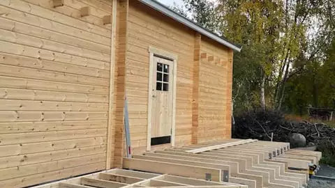 Vi rekommenderar plintgrund till våra attefallshus i timmer. Om du önskar gjuta en platta till ditt attefallshus är våra modulhus ett bättre alternativ.