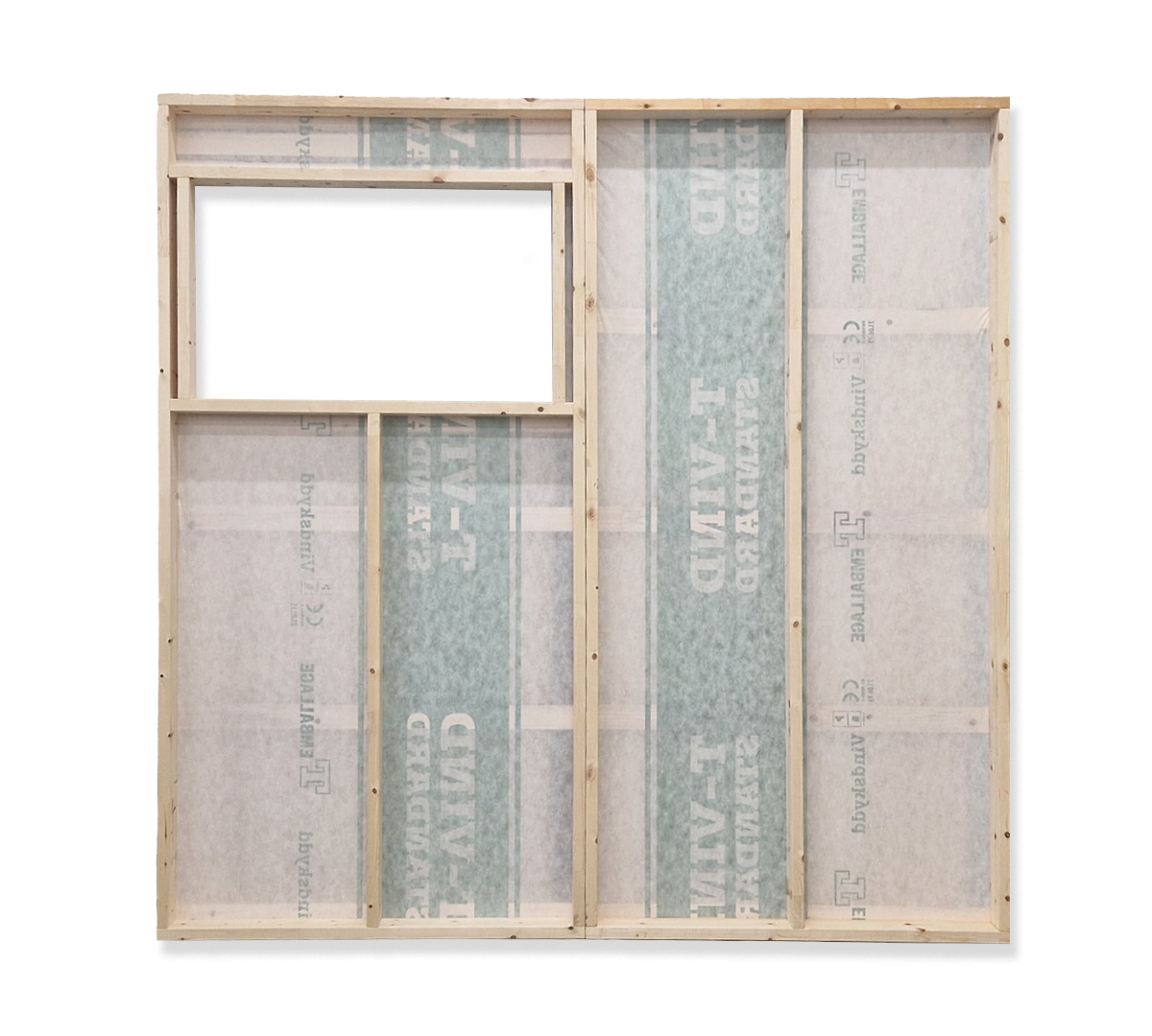 Samma väggmoduler sett inifrån. Väggmodulen är komplett och består av panel, läkt, vindduk samt reglar och kortlingar för fönster, dörr eller port. Modulerna har 34x95mm reglar i konstruktionsvirkesklass C24 med ett 2-3 regelsystem beroende på bredd på modulen