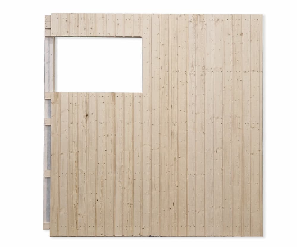 Exemplet visar två väggmoduler, 2x1200mm ihopmonterade, en tät väggmodul tillsammans med en väggmodul förberedd för fönster 10x6. Stående obehandlad panel 22x120mm.