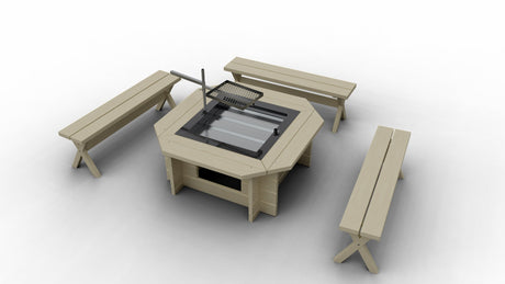 Vår grillplats levereras med tre bänkar, eldskål och höj- och sänkbart grillgaller som steglöst kan justeras till önskad nivå. Du kan även beställa extrabänkar eller ryggstöd i samband med din beställning, eller om du önskar komplettera en tidigare beställning.