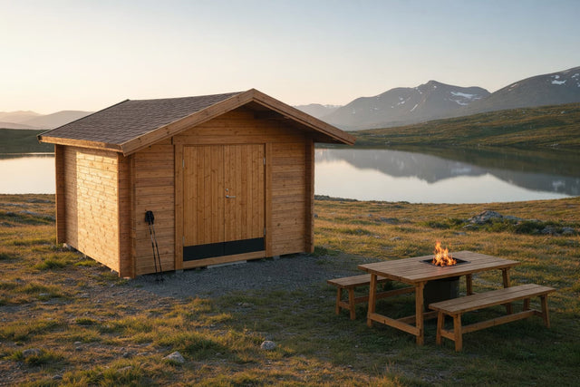 Vekt: Hytta leveres som et byggesett og kommer vanligvis i 2 trepakker + 1 dobbeldør i en pappeske.