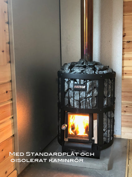 Standardpakke Svart skorstein: Røykrør og skorstein i rustfritt stål, svartlakkert, er inkludert i pakken, samt badstustein, veggmonterte beskyttelsesplater, gulvplate og steinplate til gulvet. (Den nedre delen av røykrøret er uisolert)