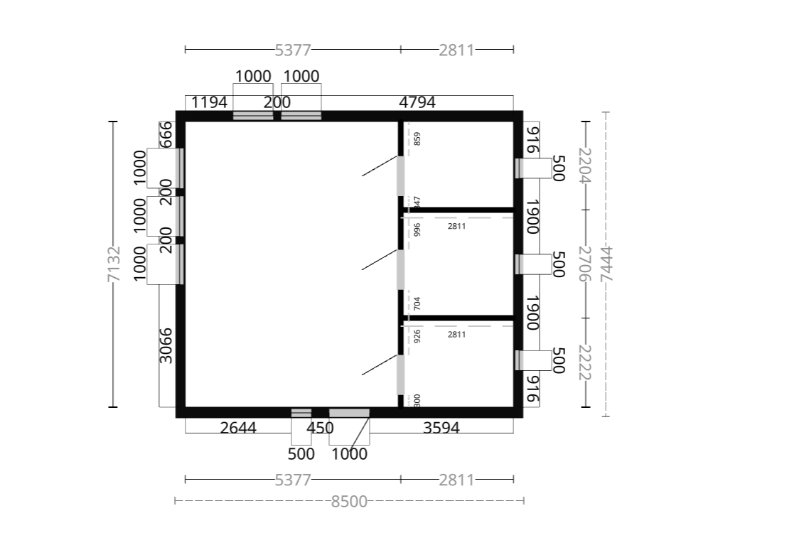 HUSKONFIGURATION - 1.0.5603901 ═══════════════════════════════════════════════════════════════ BYGGNAD: • Storlek: 7444×8500mm (63.27m²) • Total byggarea: 7444mm x 8500mm (63.27m²) • Vägghöjd - Väggpanel: 2.387m • Taktyp: Fackverktakstol () • Takfärg: Svart • Takavvattning: Nej • Färg vägg: Obehandlad • Färg Vindskivor och foder: Grundmålad vit TEKNISKA SPECIFIKATIONER: • Takvinkel: 22° • Nockhöjd: 4.190m • Nocklängd: 9.480m • Längd Taknock till takfot: 4.519m • Undertak: Undertak med kondensduk & läkt ISOLERING: • Tak: 145mm • Vägg: 95.00mm OSB: • Tak m²: 62.90 • Vägg m²: 137.54 INNERVÄGG: Storlek m²: 30.61 Dörr: 3x Innerdörr 8x21 Tillbehör: MODULER (32 st totalt): • 2X Modul 5x12 3-glasfönster vridfönster - m12 • 1X Modul 5x5 2-glasfönster sidohängt - m12 • 1X Modul Ytterdörr med smalt fönster 10x21 - m12 • 1X Modul 5x18 3-glasfönster fast dubbelhärdat - m12 • 5X Modul 10x18 3-glasfönster fast dubbelhärdat - m12 • 2X Modul h4v • 4X Modul m3 • 14X Modul m12 • 2X Modul h4h