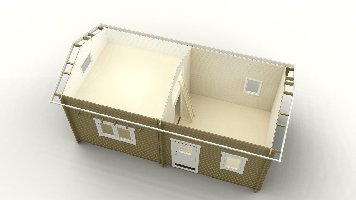 Attefallshus Brusan Loft Torp har en genomtänkt planlösning som ger maximal flexibilitet. Den rymliga interiören består av ett stort allrum/kök på 15 kvm samt ett sovrum på 15 kvm. Sovrummet kan enkelt delas av med en mellanvägg för att skapa ytterligare ett rum. På så sätt kan du anpassa huset efter dina behov, till exempel genom att lägga till ett badrum eller en bastu. Mellanväggarna som levereras är täta, vilket gör att du själv kan välja var och hur stora öppningarna ska vara. Detta ger dig full kontroll över hur du utformar ditt attefallshus.