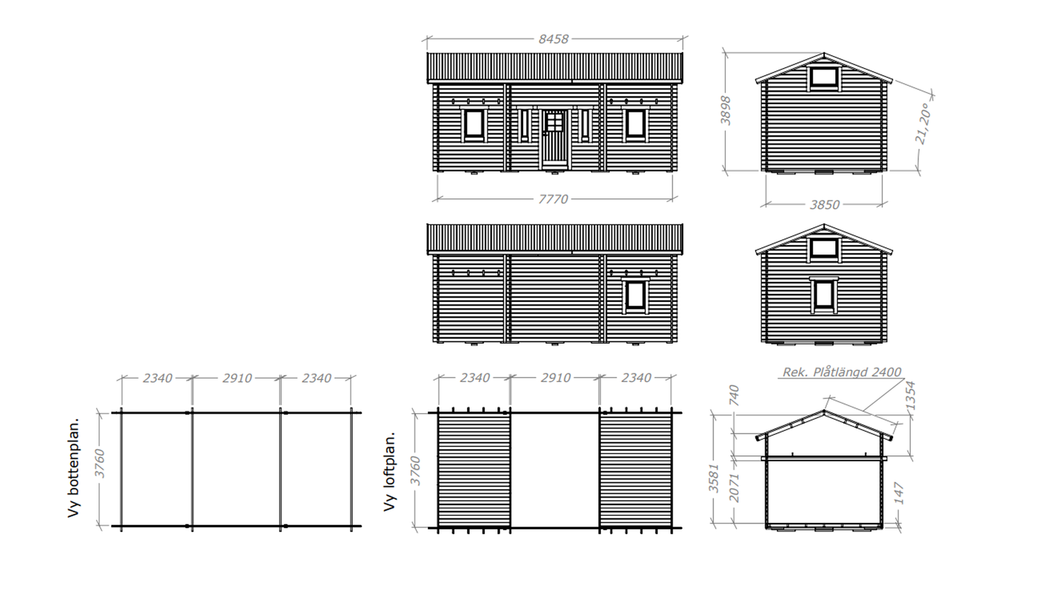 Fönster: 6st 670x945mm öppningsbara med isolerglas och beslag. 2st Fasta 255x945mm.