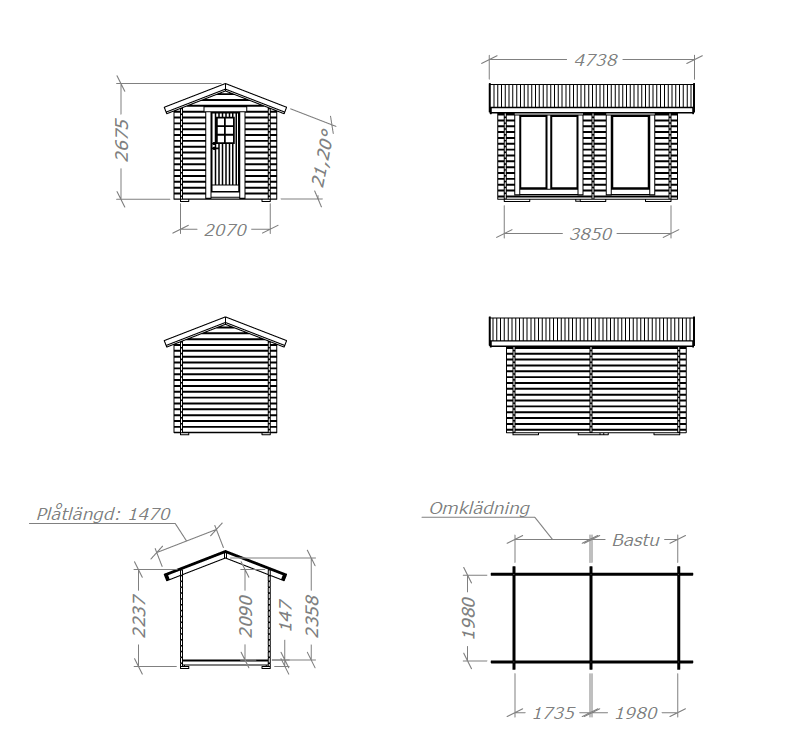 Mått: Utv. mått: 385 × 207 cm / Inv. mått omklädningsdel: 173,5 x 198cm Bastudel: 198 x 198cm