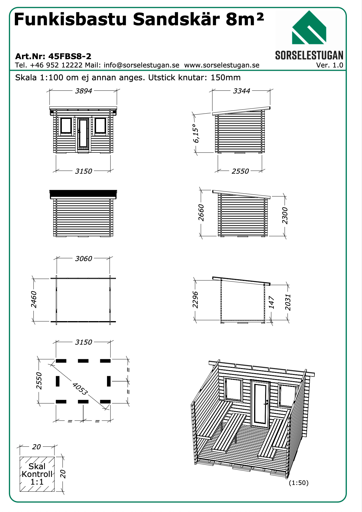 Vikt: Stugan levereras som byggsats och kommer normalt i 2st virkespaket samt 1st ytterdörr i kartong, fönster som ingår packas normalt in i virkespaketen. Vikt totalt: ca: Vikt totalt ca: 1120kg (per kolli ca: 740kg / 320kg / 30kg)