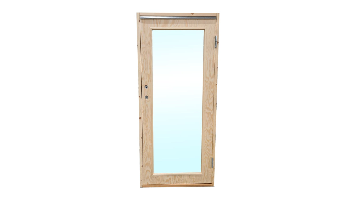 Helglasdörr för uppvärmda utrymmen. Stort dubbelhärdat fönster (energiglas) ger fint ljusinsläpp.