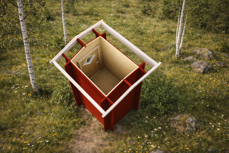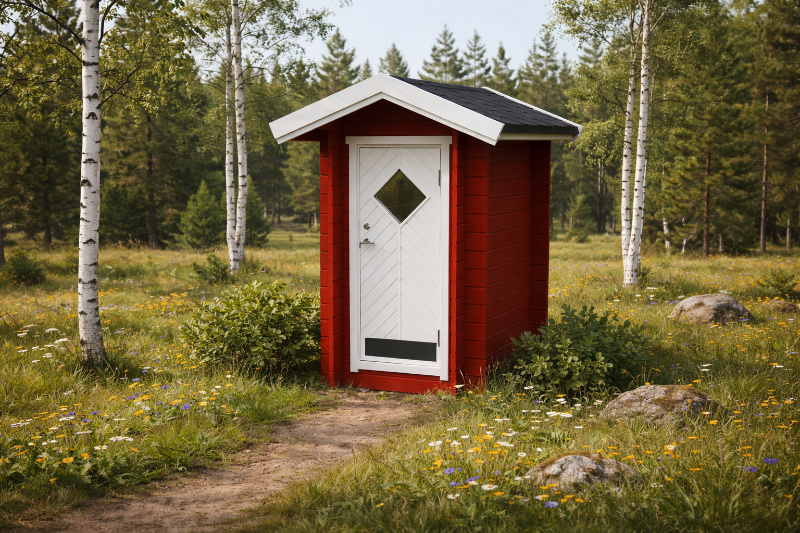 Mysigt utedass på 1,2 kvm med en fin trädörr med fönster. Anpassa utedasset efter behov och komplettera med förbränningstoa, separett eller klassisk sittbänk.