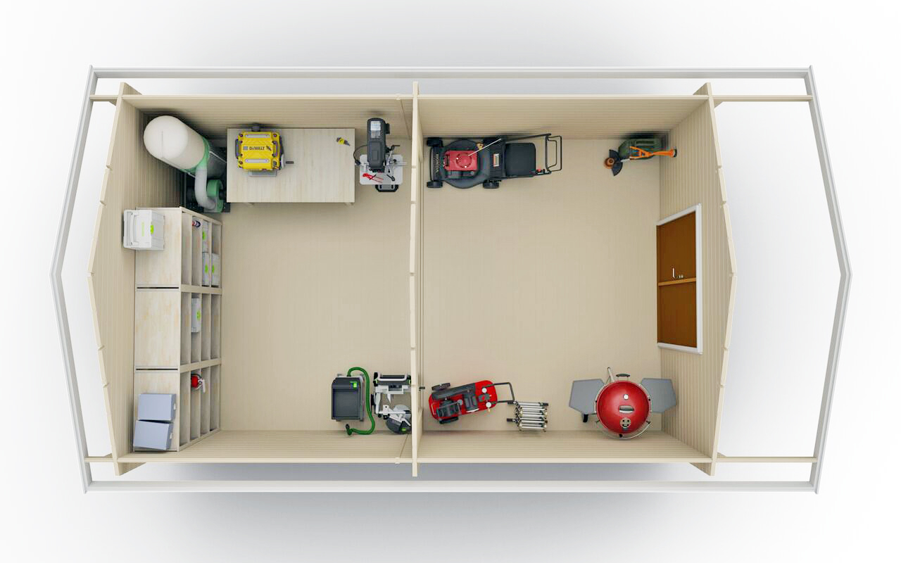Några av våra kunder har valt att hålla de två rummen skilda från varandra genom att beställa en förrådsdörr som separat ingång från långsidan på förrådet till det inre rummet. Man har då förvarat trädgårdsmaskiner och redskap i det yttre förrådsutrymmet där pardörren ger förutsättningar att köra in exempelvis en åkgräsklippare. Den bakre delen har man sedan isolerat och använt som arbetsbod eller hobbyrum.