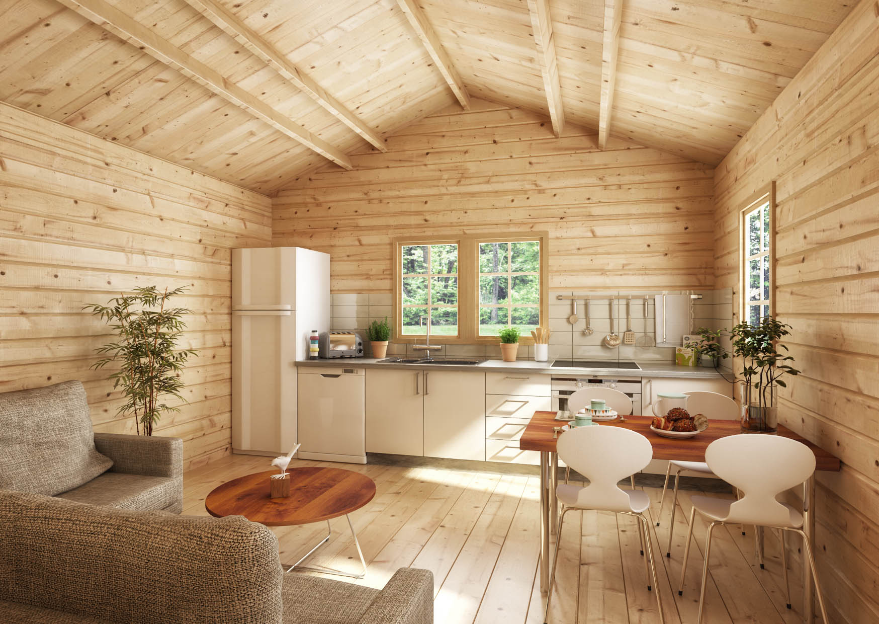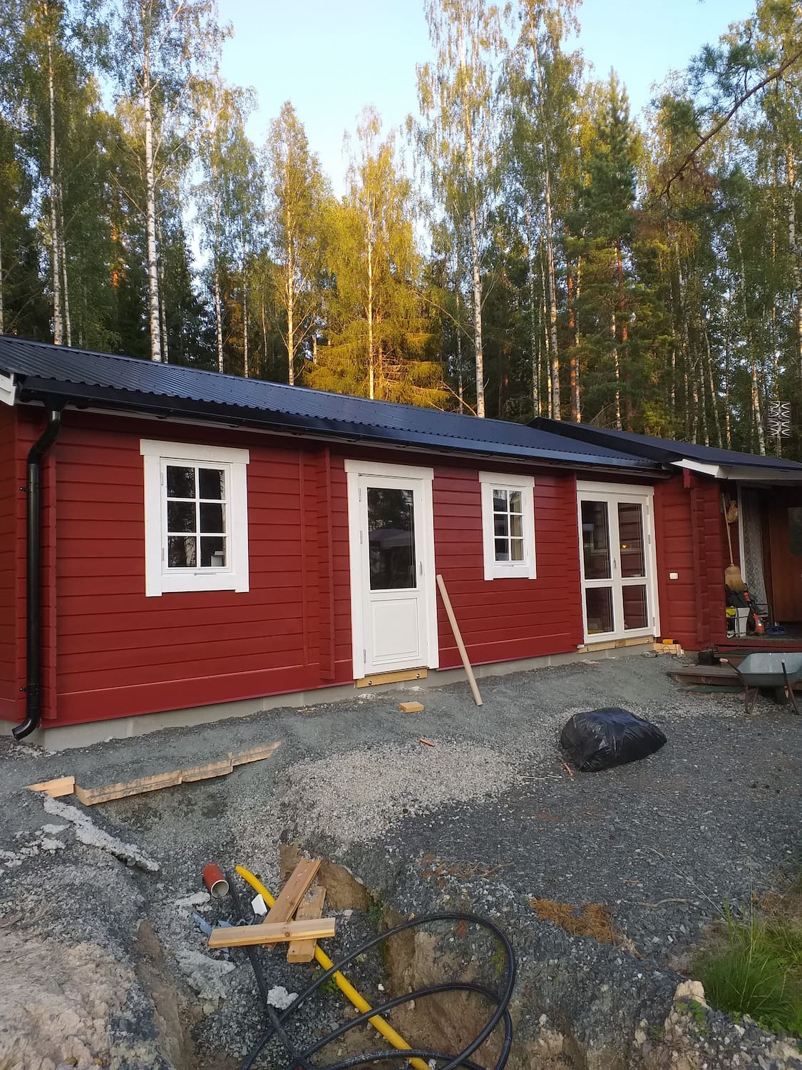 45x145mm profilhyvlat, geringsknutat timmer med infräst spår och tätningslist till knutar och spont samt en inknutad mellanvägg. Mellanväggen som delar av stugan levereras hel utan öppning. Kunden får själv ta upp och anpassa öppningen i mellanväggen till en större eller till en alt. två mindre dörröppningar efter eget önskemål.
