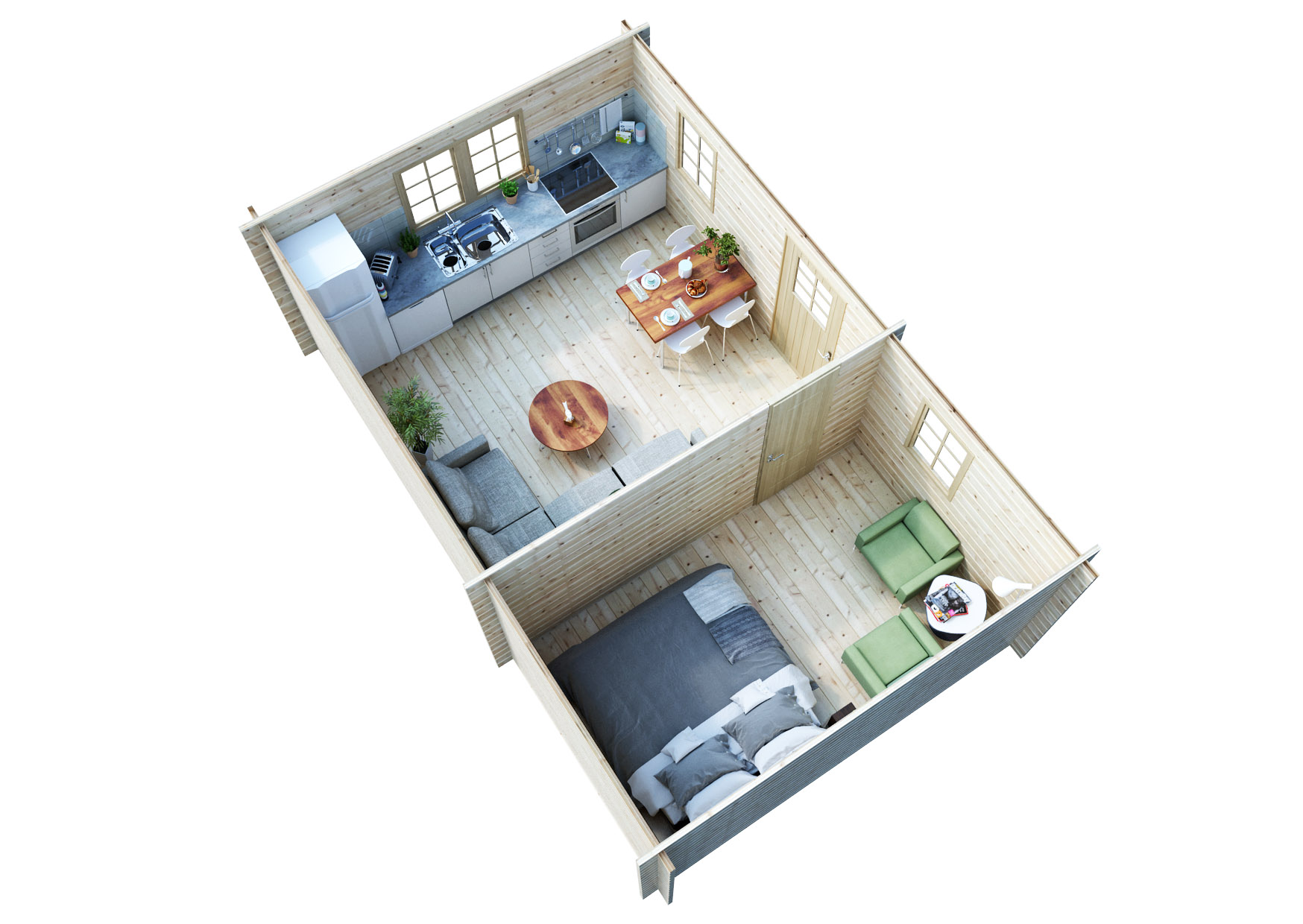 Vårt Attefallshus torp 24 kvm har ingången placerad på långsidan vilket ger ett lantligt intryck. När du kliver in i attefallshuset kommer du in i allrummet på 15 kvm som enkelt kan inredas efter behov. Sovrummet på 9 kvm kan delas upp genom att regla upp en mellanvägg för att rymma badrum eller bastu. I vårt grundutförande är sovrummet till vänster när du kommer in i stugan, men eftersom planlösningen går att spegelvända går det även bra att placera sovrummet på motsatt sida. Innerväggen till sovrummet är tät och du väljer själv var du önskar placera dörren till sovrummet. Om du planerar att använda attefallshuset som hemmakontor eller lokal för att utöva din hobby går detta även bra. Du kan även välja att göra en större öppning i innerväggen mellan rummen för att få en öppen planlösning.