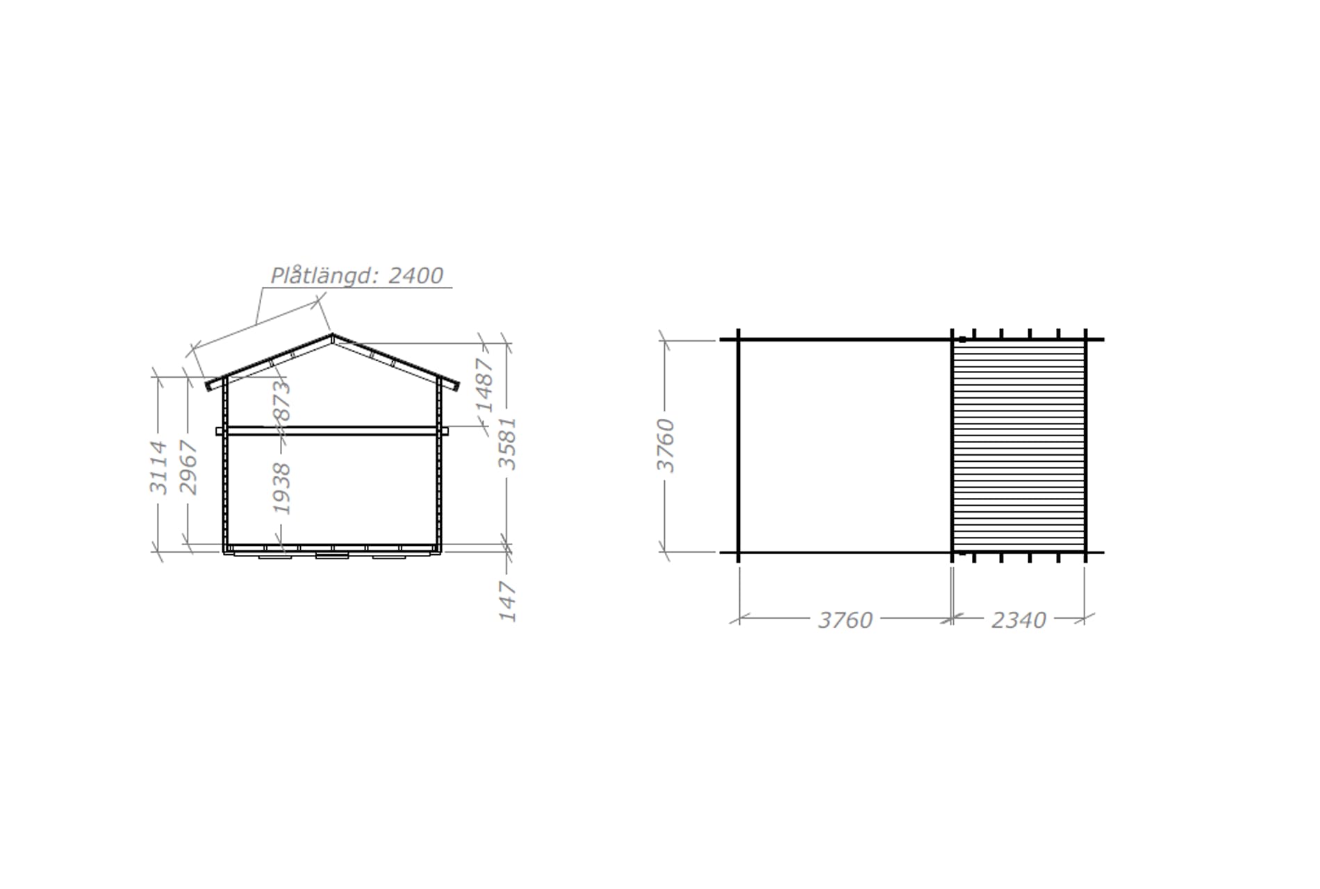 Om du önskar kunna placera både fönster och dörrar på valfri plats så är våra täta grundmodeller ett bra alternativ. Vi levererar denna byggsats med täta väggar vilket innebär att du själv kan välja placering för dörr och fönster och såga upp hålen för dessa själv. Med denna byggsatsen kan du själv välja storleken på dina fönster samt om du vill ha några fönster ihopmonterade eller inte. Denna modell har ett förlängt takutstick på ena gavel som ger extra tak ovan entre från gavel.