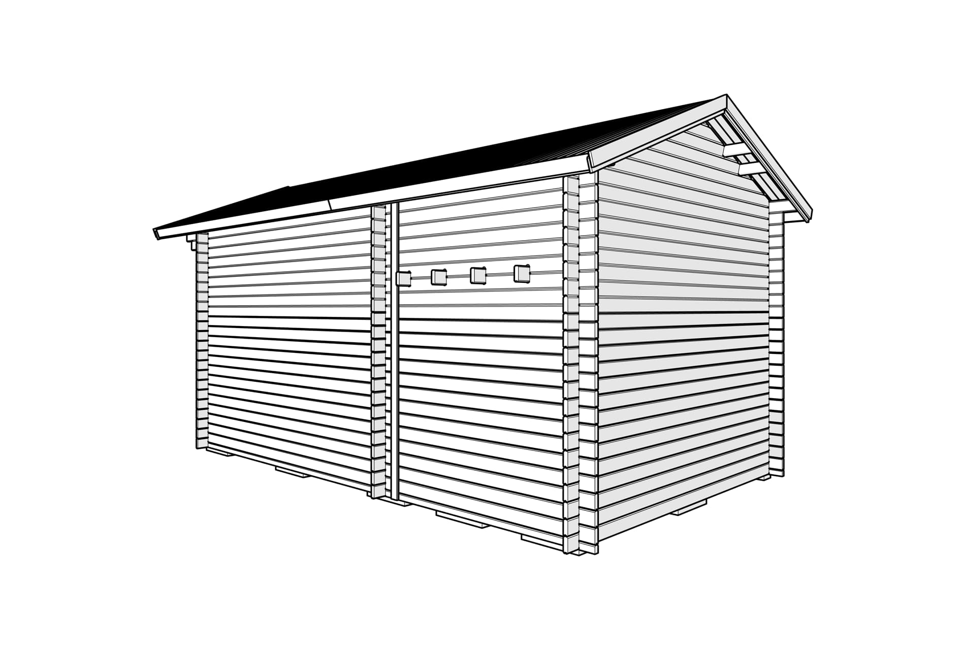 45x145mm profilhyvlat, geringsknutat timmer med infräst spår och tätningslist till knutar och spont samt en inknutad mellanvägg. Mellanväggen som delar av stugan levereras hel utan öppning. Kunden får själv ta upp och anpassa öppningen i mellanväggen till en större eller till en alt. två mindre dörröppningar efter eget önskemål.