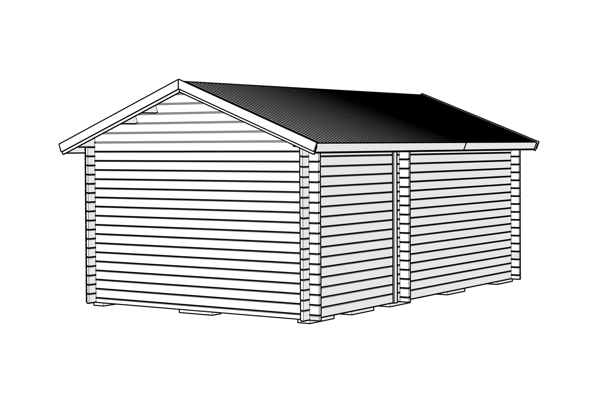 45x145mm profilhyvlat, geringsknutat timmer med infräst spår och tätningslist till knutar och spont samt en inknutad mellanvägg. Mellanväggen som delar av stugan levereras hel utan öppning. Kunden får själv ta upp och anpassa öppningen i mellanväggen till en större eller till en alt. två mindre dörröppningar efter eget önskemål.