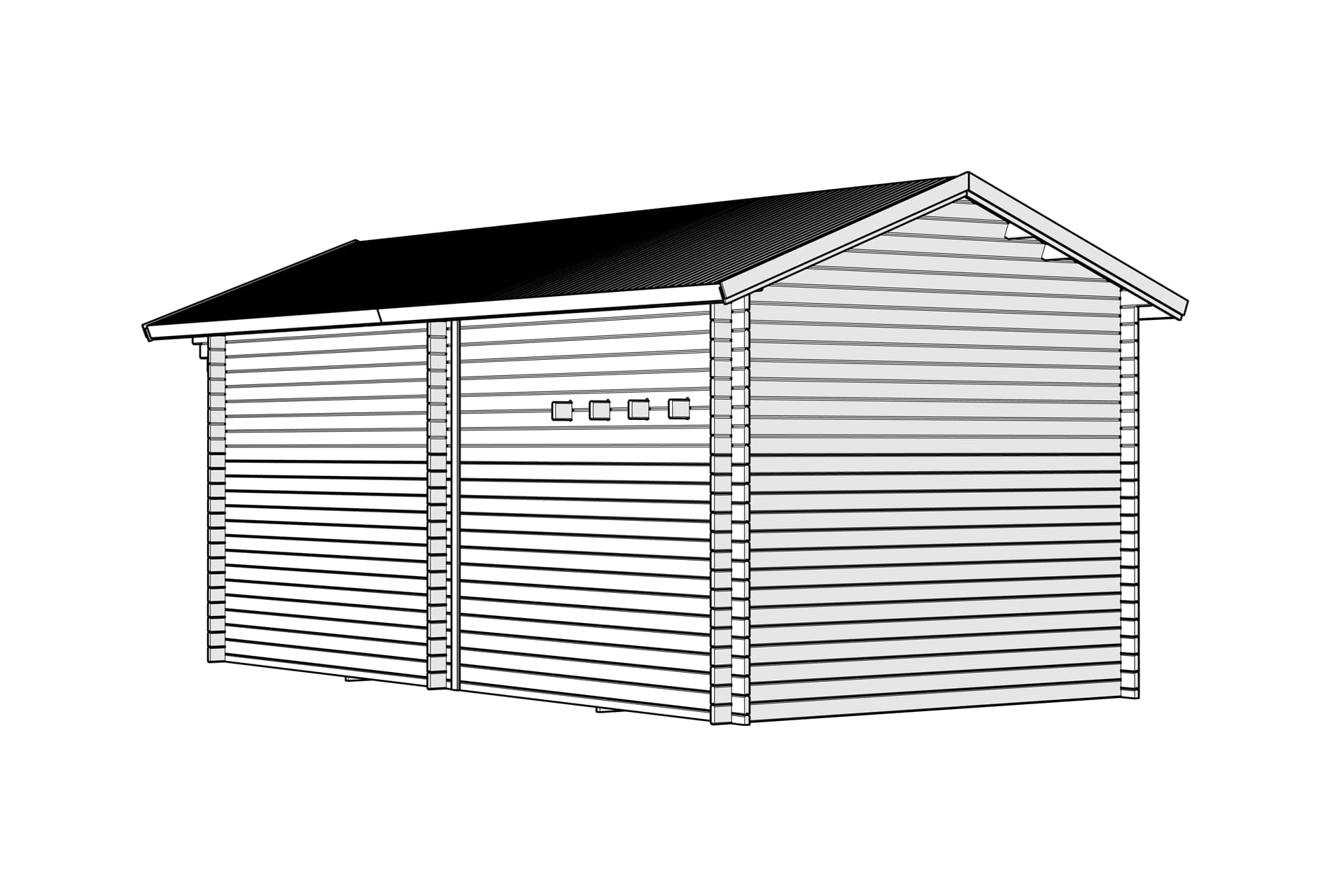 45x145mm profilhyvlat, geringsknutat timmer med infräst spår och tätningslist till knutar och spont samt en inknutad mellanvägg. Mellanväggen som delar av stugan levereras hel utan öppning. Kunden får själv ta upp och anpassa öppningen i mellanväggen till en större eller till en alt. två mindre dörröppningar efter eget önskemål.