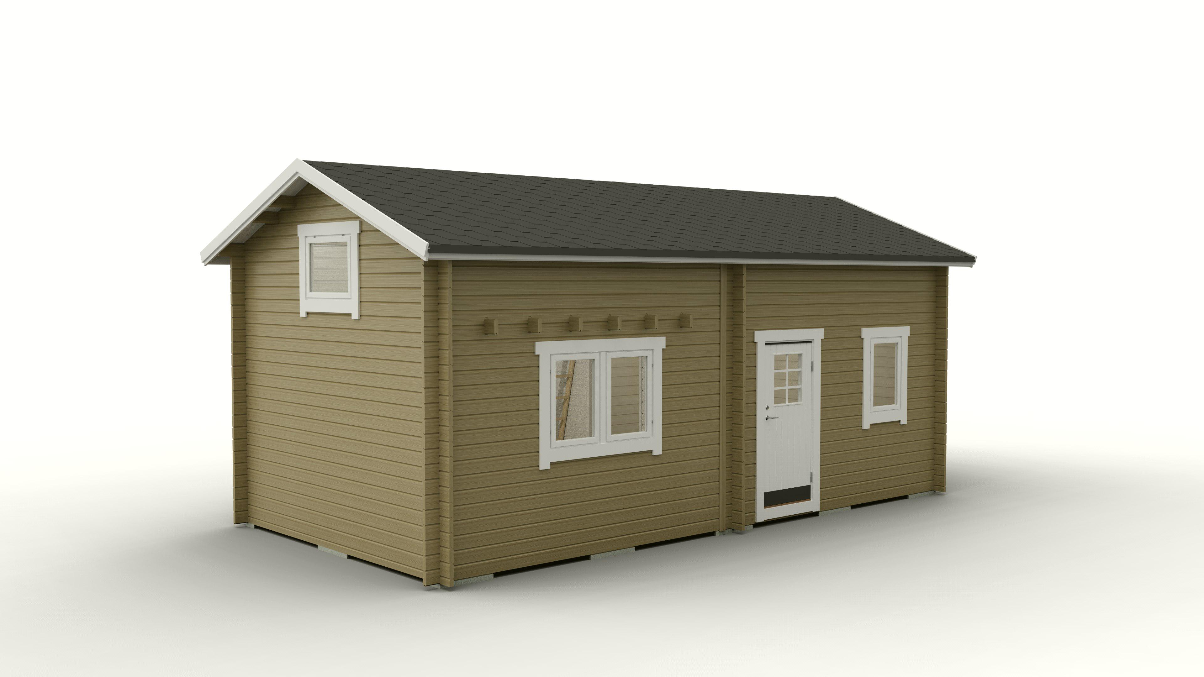 45x145mm profilhyvlat, geringsknutat timmer med infräst spår och tätningslist till knutar och spont samt en inknutad mellanvägg. Mellanväggen som delar av stugan levereras hel utan öppning. Kunden får själv ta upp och anpassa öppningen i mellanväggen till en större eller till en alt. två mindre dörröppningar efter eget önskemål. Öppning upp till loftet görs av kund och anpassas efter behov.