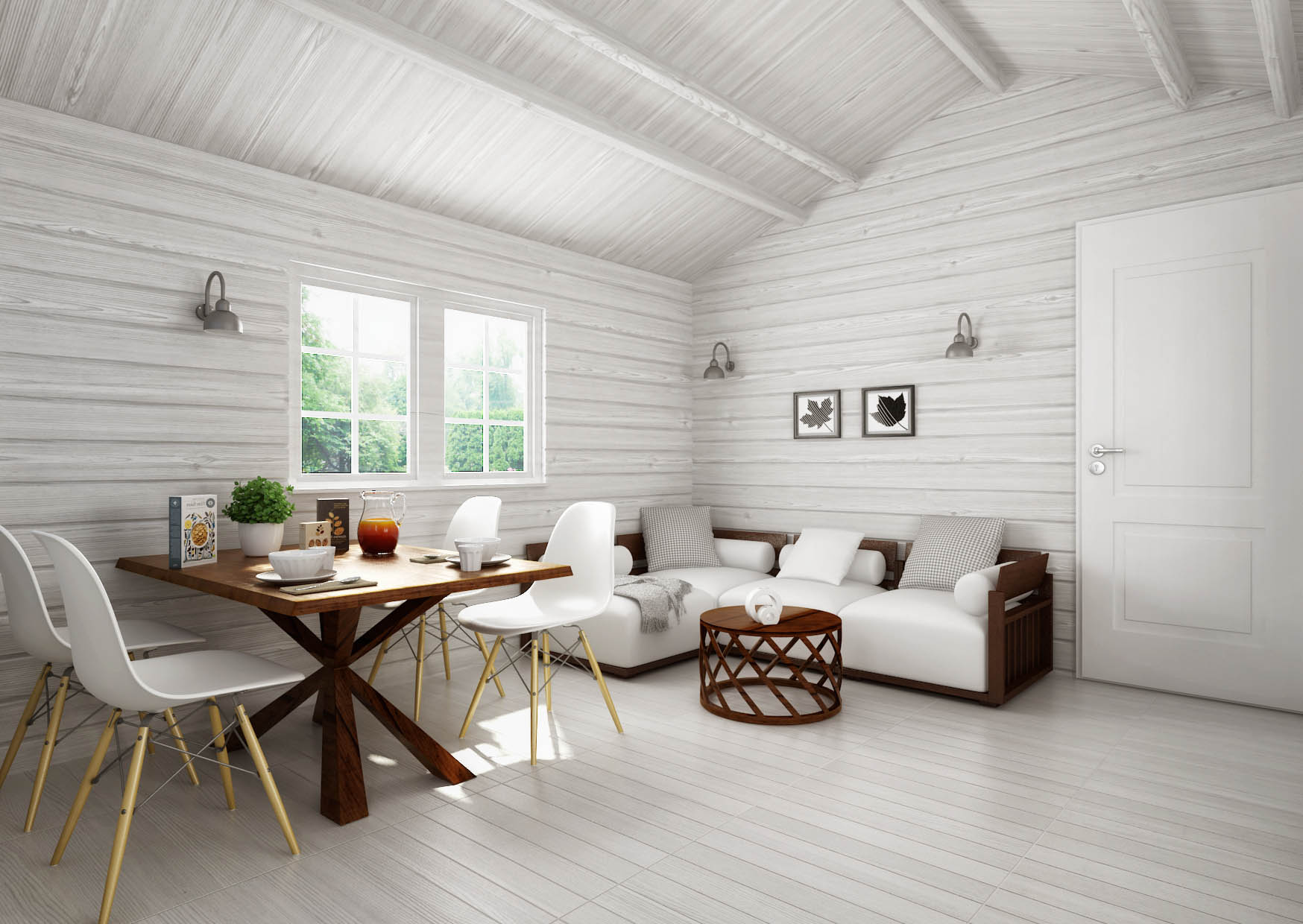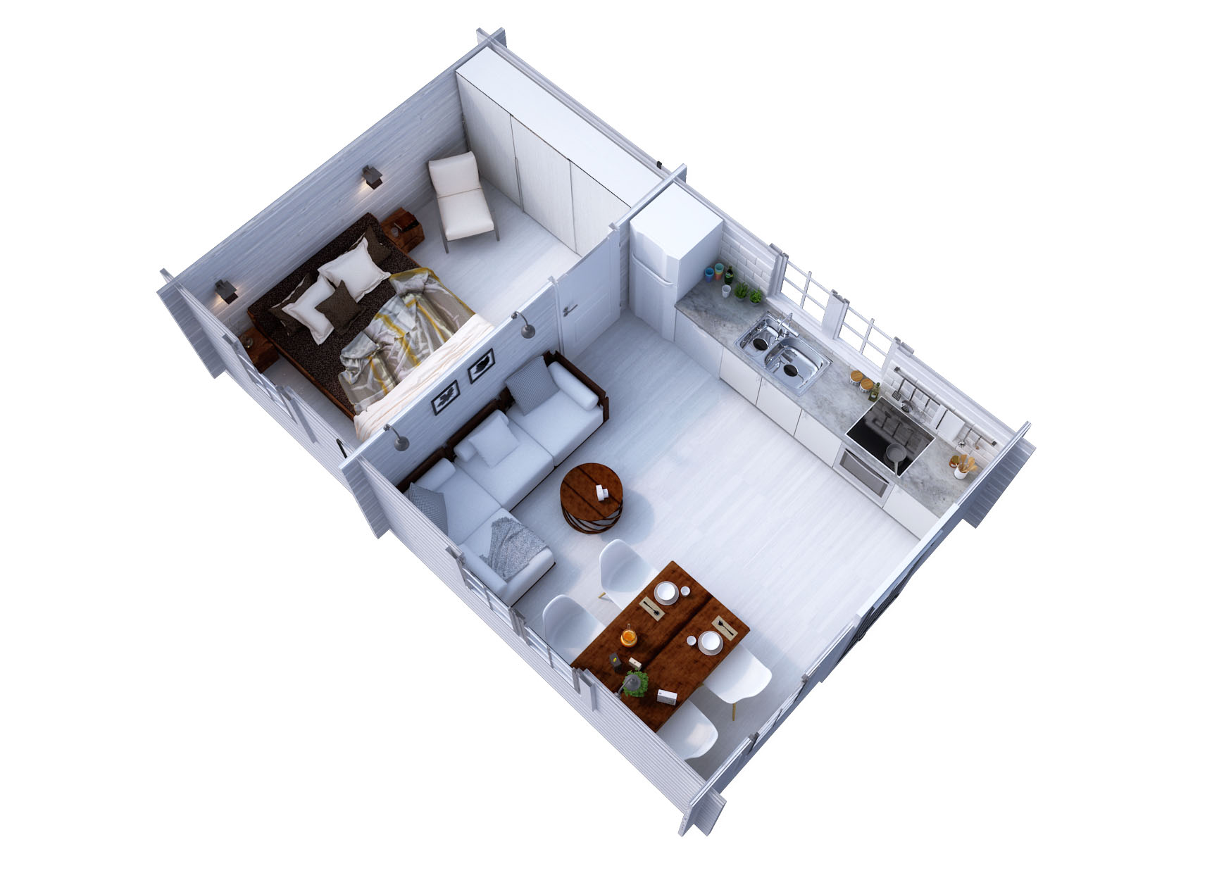 45x145mm profilhyvlat, geringsknutat timmer med infräst spår och tätningslist till knutar och spont samt en inknutad mellanvägg. Mellanväggen som delar av stugan levereras hel utan öppning. Kunden får själv ta upp och anpassa öppningen i mellanväggen till en större eller till en alt. två mindre dörröppningar efter eget önskemål.