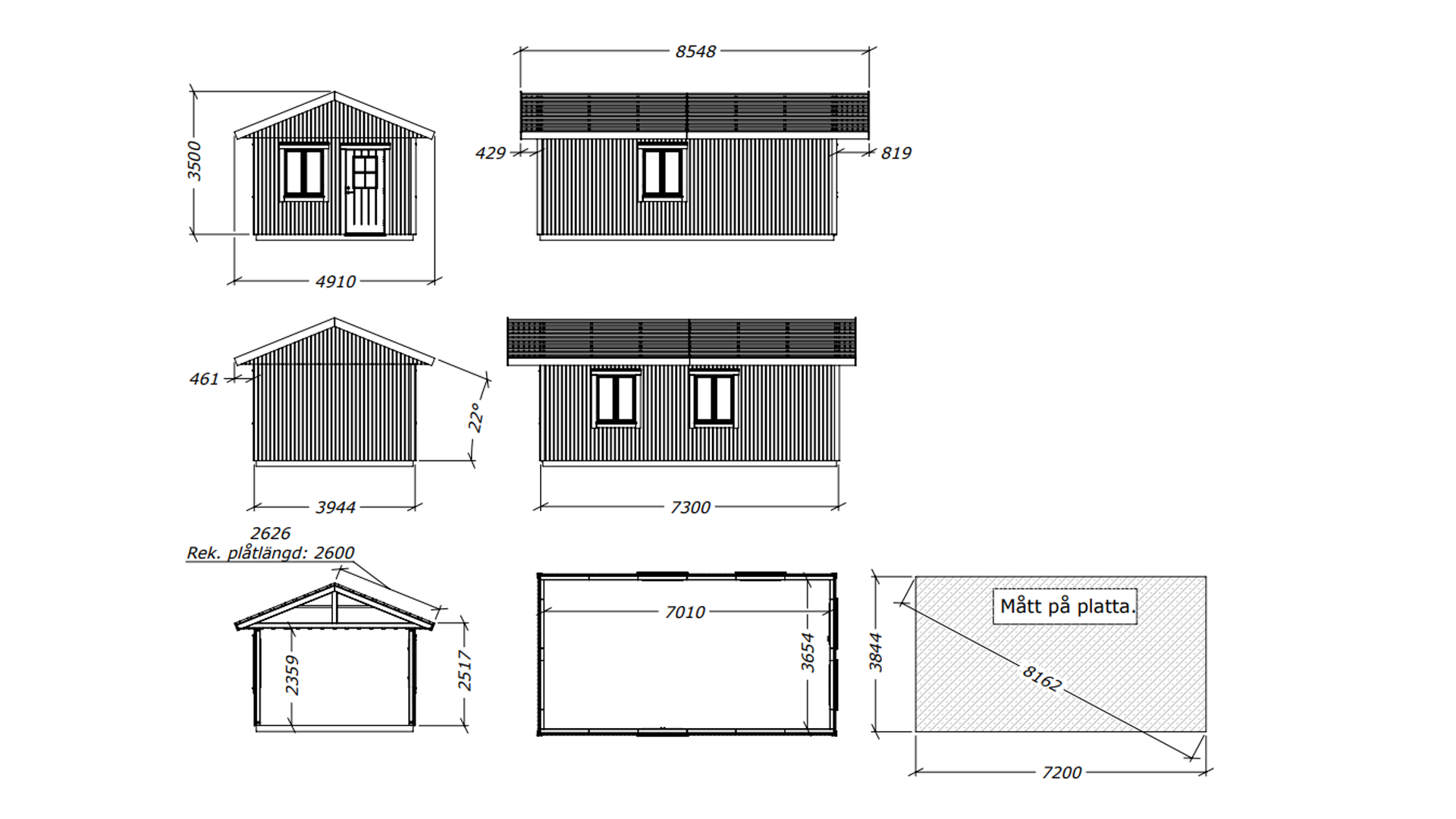 Plåttaken innehåller: takplåt i full längd, fotplåt, nockplåt, vindskivebeslag, tätningsband samt skruv