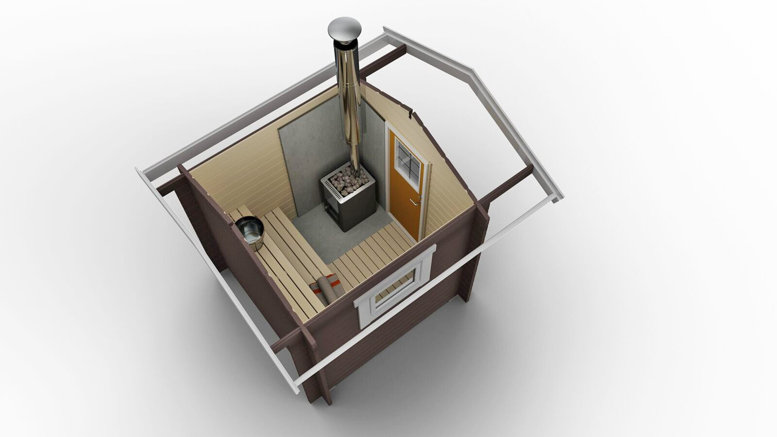 Bastuflotte 4,8×6,0 (29m2) inklusive bastukamin Harvia M3, takshingel, underlagspapp och dörrhandtag med lås. Du kan även få en större flotte och större bastu.