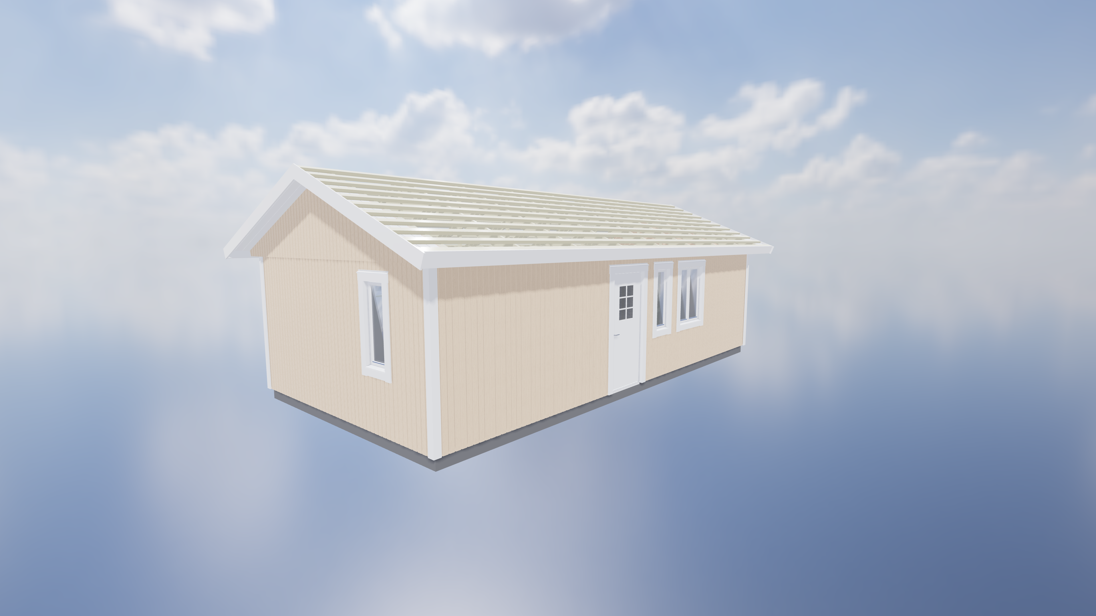 Taket består av takstolar cc1200 anpassade standard efter snözon 4,5. På takstolarna läggs trampsäker kondensduk och bärande takläkt/rote 45x95mm. I taket ingår även vindskivor och takfotsbrädor 22x195mm samt underspikning 22x120mm och glespanel 28x70. Väggpanel till gavel ingår som lösvirke och kapas och monteras när takstolarna och gavlarna är på plats.