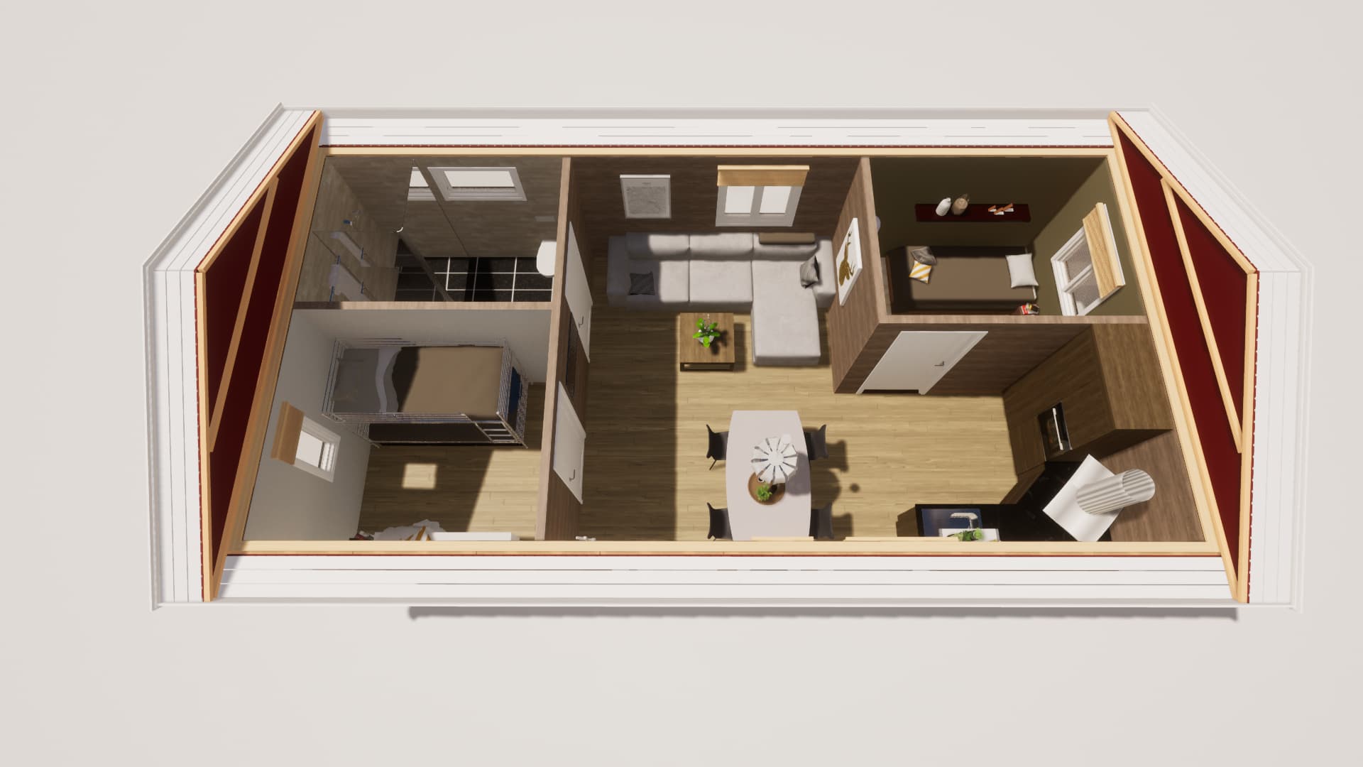 Vårt nya fritidshus Ammarfjället ger med sina rymliga 47 kvm ett mångsidigt fritidshus med många möjligheter. Bland bilderna ser du förslag på rumsindelning där du får plats med två sovrum, badrum och en öppen planlösning för kök och sällskapsrum. Byggsatsen innefattar ej innerväggar vilket innebär att du kan bygga upp planlösningen som du önskar. Viktigt att komma ihåg är att du enkelt kan flytta både fönster och dörrplacering i vår 3d-konfigurator om du önskar anpassa grundmodellen efter dina behov.