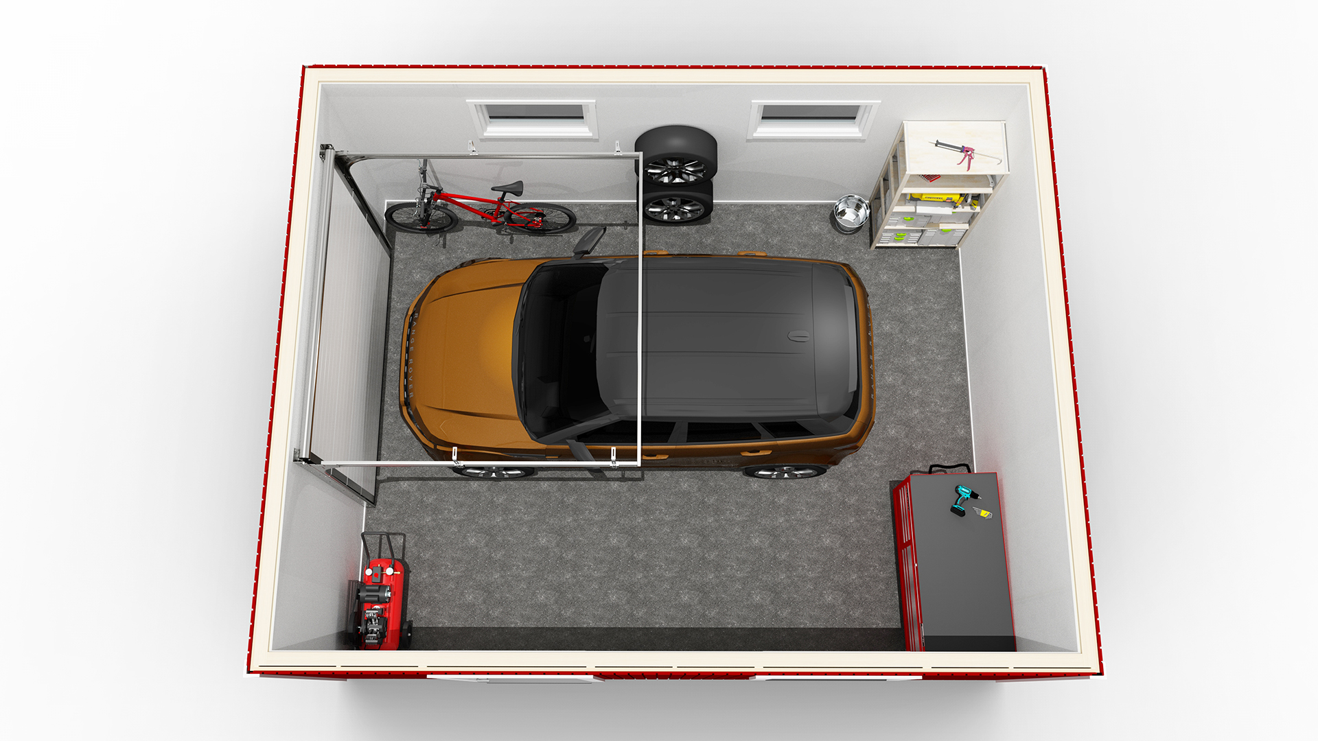 Attefallsgarage M1 30 kvm är lämpligt för små och medelstora bilar. Denna garagemodell ger dig ett kompakt och mångsidigt garage som rymmer både din bil och förvaring. Du kan använda den fria ytan bredvid bilen som förvaring eller plats för en verktygstavla med arbetsbänk. Garaget har egen ingång från långsidan och byggsatsen levereras med 3 fönster, en dörr och en slagport i trä som du kan välja att uppgradera till en hörmann skjutdörr.