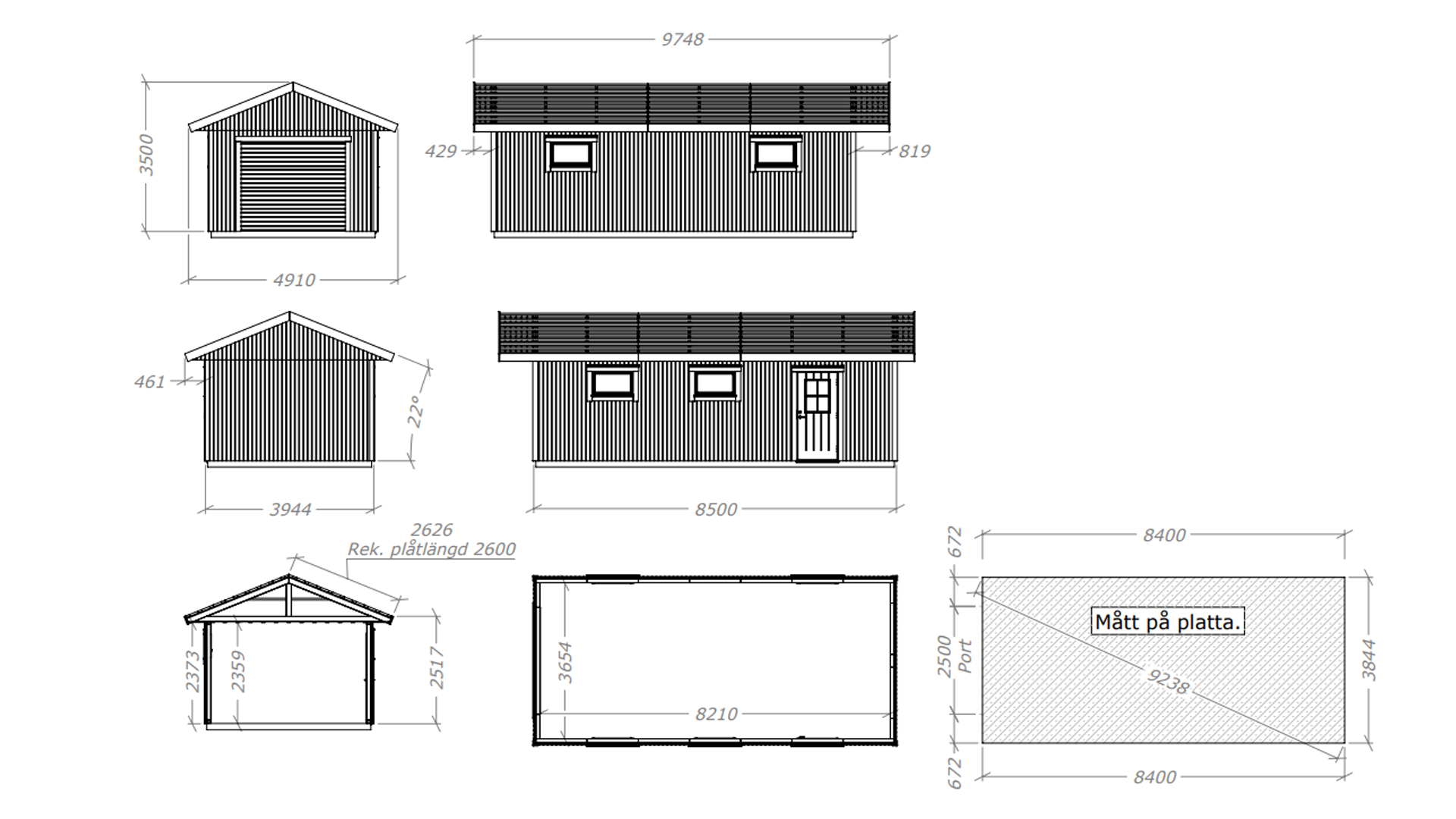 Våra väggmoduler finns i följande bredder, 1200mm, 1000mm, 700mm, 600mm, 300mm och en gavelmodul för garageportar 2500mm. Väggmodulerna monteras motsols från ett hörn på medföljande syll. Väggmodulen har en hög färdiggrad för snabb montering. Modulerna har som standard 34x95mm reglar i konstruktionsvirkesklass C24 med ett 2-3 regelsystem beroende på bredd på modulen. Regeltjockleken 34x145 finns även som alternativ i vår konfigurator. Varje modul har vindduk, läkt och påspikad väggpanel 22x120mm. Syll 45x95mm och hammarband 34x95mm. Vi erbjuder två alternativ på vägghöjd 2,4 meter och 2,7 meter.
