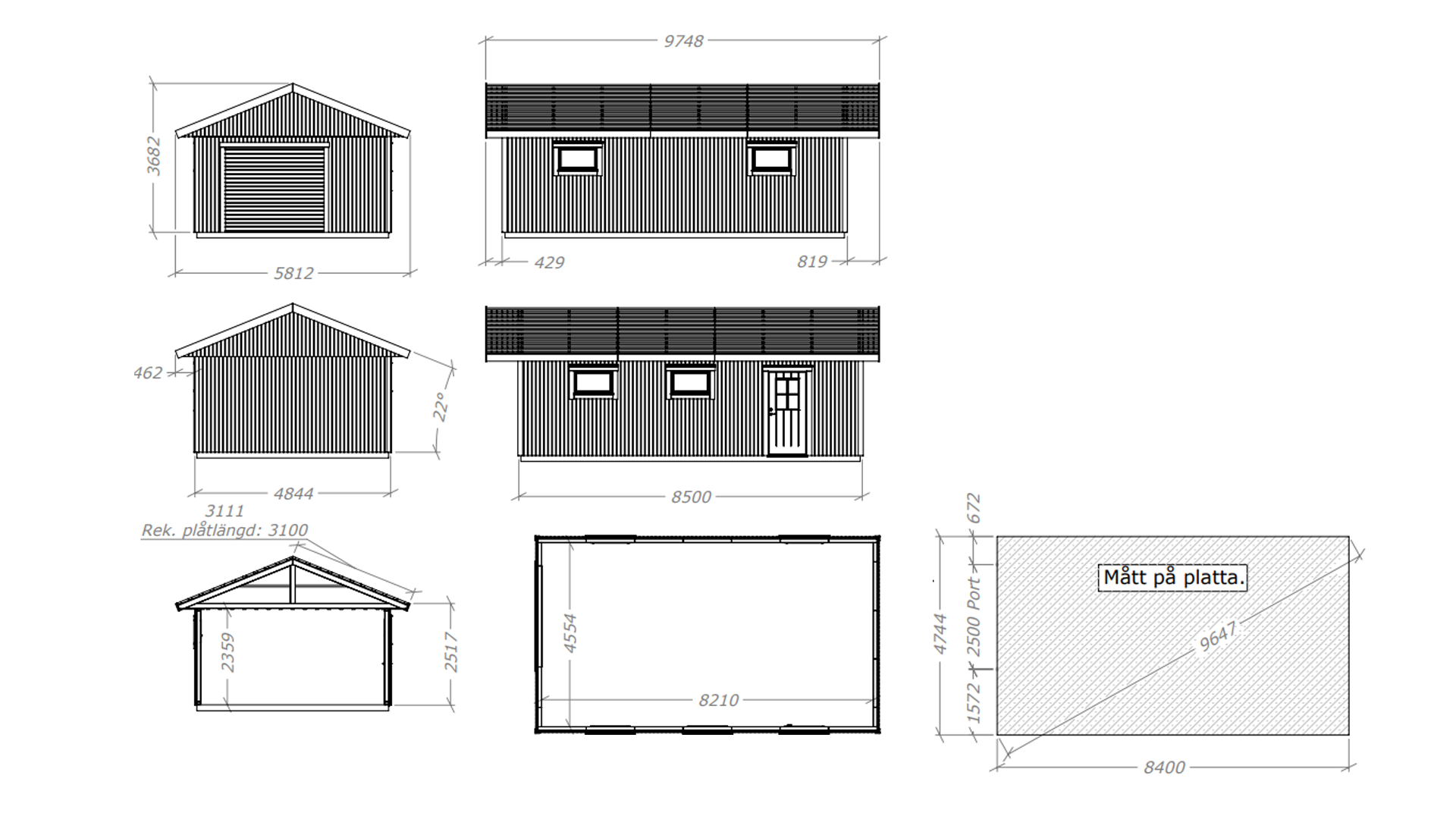 Våra väggmoduler finns i följande bredder, 1200mm, 1000mm, 700mm, 600mm, 300mm och en gavelmodul för garageportar 2500mm. Väggmodulerna monteras motsols från ett hörn på medföljande syll. Väggmodulen har en hög färdiggrad för snabb montering. Modulerna har som standard 34x95mm reglar i konstruktionsvirkesklass C24 med ett 2-3 regelsystem beroende på bredd på modulen. Regeltjockleken 34x145 finns även som alternativ i vår konfigurator. Varje modul har vindduk, läkt och påspikad väggpanel 22x120mm. Syll 45x95mm och hammarband 34x95mm. Vi erbjuder två alternativ på vägghöjd 2,4 meter och 2,7 meter.
