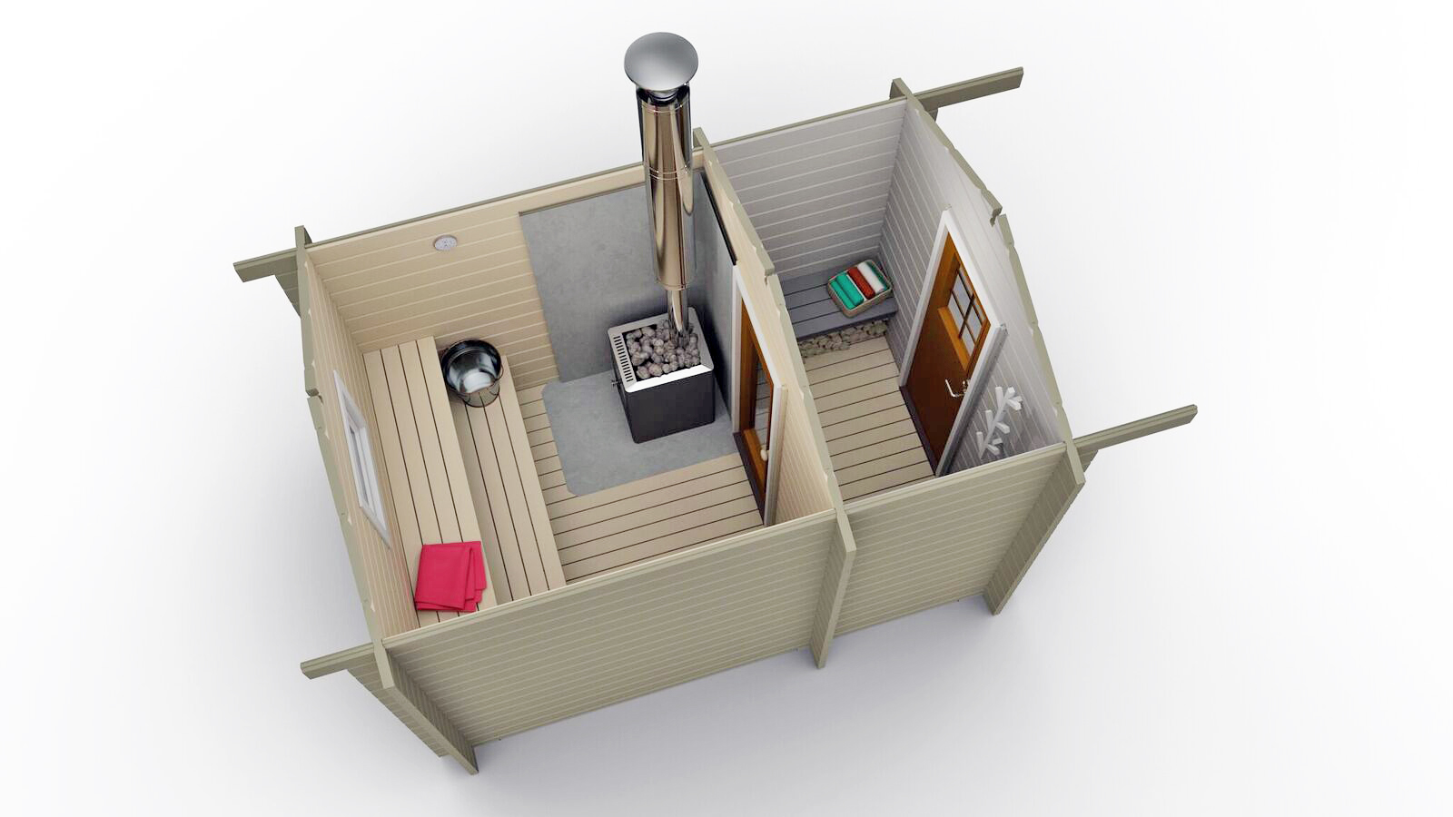Bastustuga Getskär 6,5 kvm är vår minsta bastumodell med omklädningsrum. Den kompakta bastun är snabb att värma upp och du kan snabbt avnjuta ett skönt bastubad.