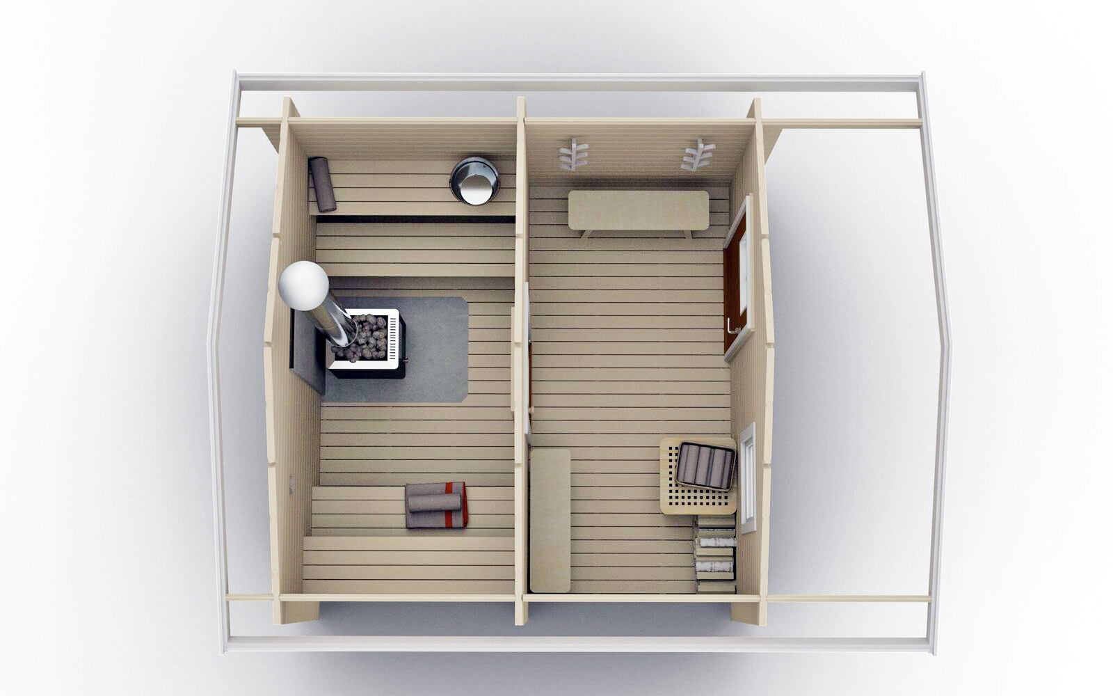 Bastustuga Småskär 9,9 kvm erbjuder både en rymlig bastudel tillsammans med omklädningsrum. Denna modellen innehåller 4 bastulavar, 2 på varje sida om bastukaminen, vilket gör den optimal för sociala och trevliga bastubad.