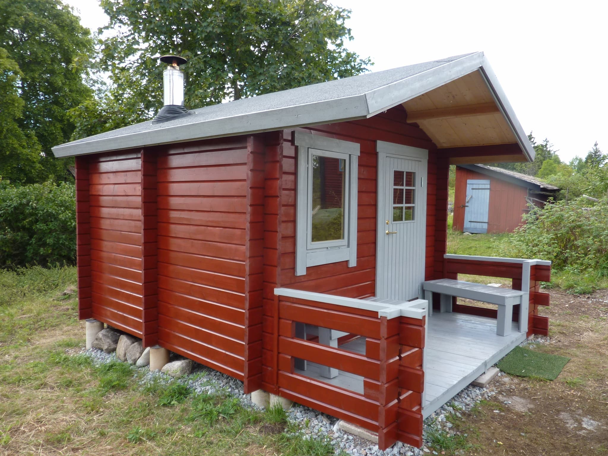 Harvia Kaminpaket (finns som tillbehör) Yttre takbeklädnad (takshingelpaket finns som tillbehör) Handtag och låscylinder (finns som tillbehör) Spröjs till fönster (finns som tillbehör) Skruvsats (finns som tillbehör) Veranda (finns som tillbehör)