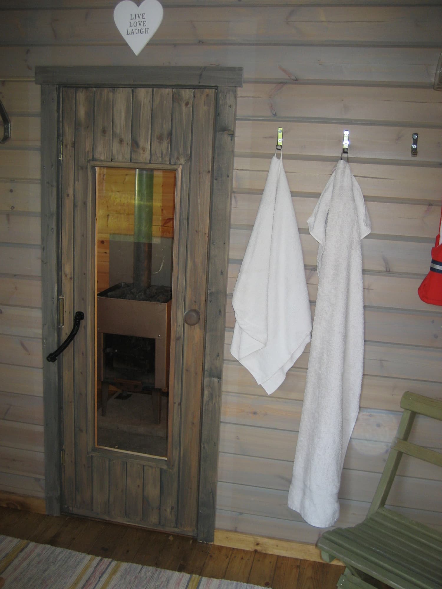 Foder till fönster och dörr. 4st bastulavar med fästen, vill man så kan man placera någon av dessa lavar/bänkar i omklädningsrummet.