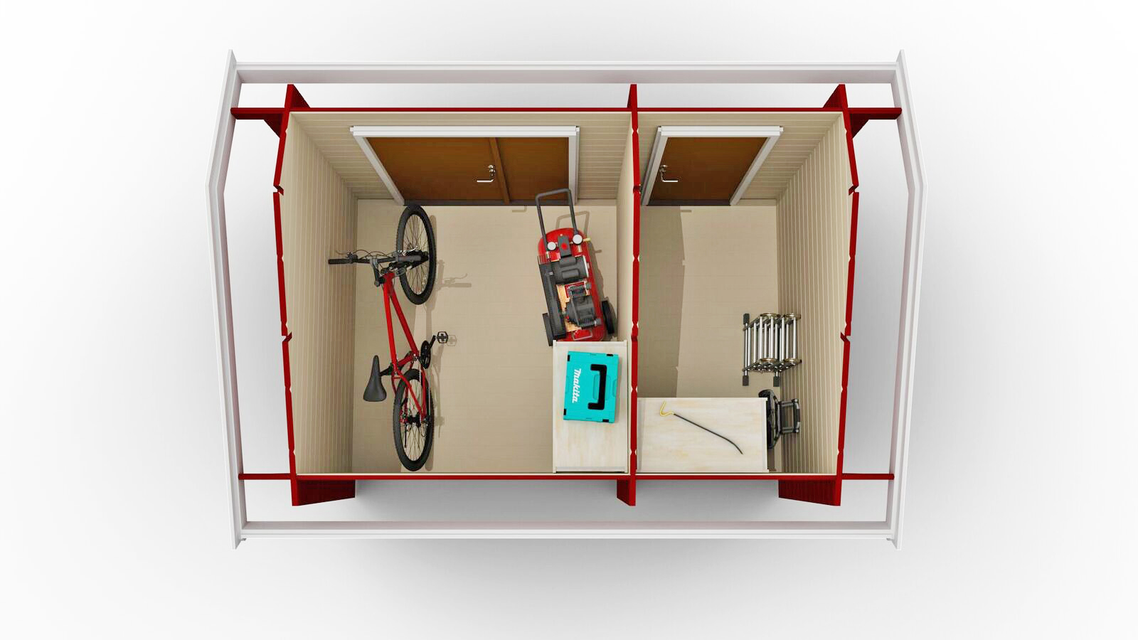 Det första rummet är utrustat med en enkel dörr, vilket gör det idealiskt för förvaring av mindre föremål eller utrustning. Det är även vanligt att använda detta utrymmet för ett utedass eller installera en förbränningstoalett. Det andra rummet har en pardörr, vilket ger en stor öppning till förrådet som underlättar vid förvaring av större trädgårdsmaskiner eller utrustning.