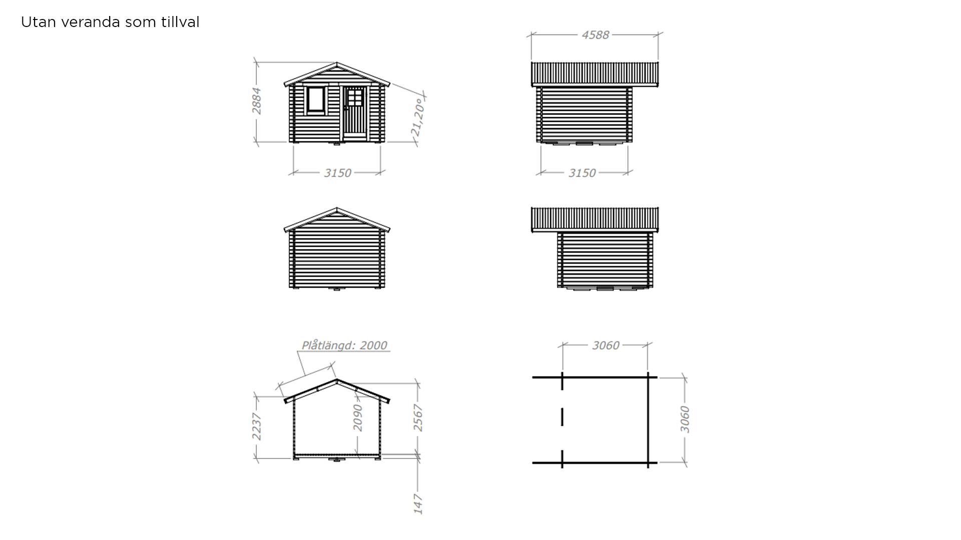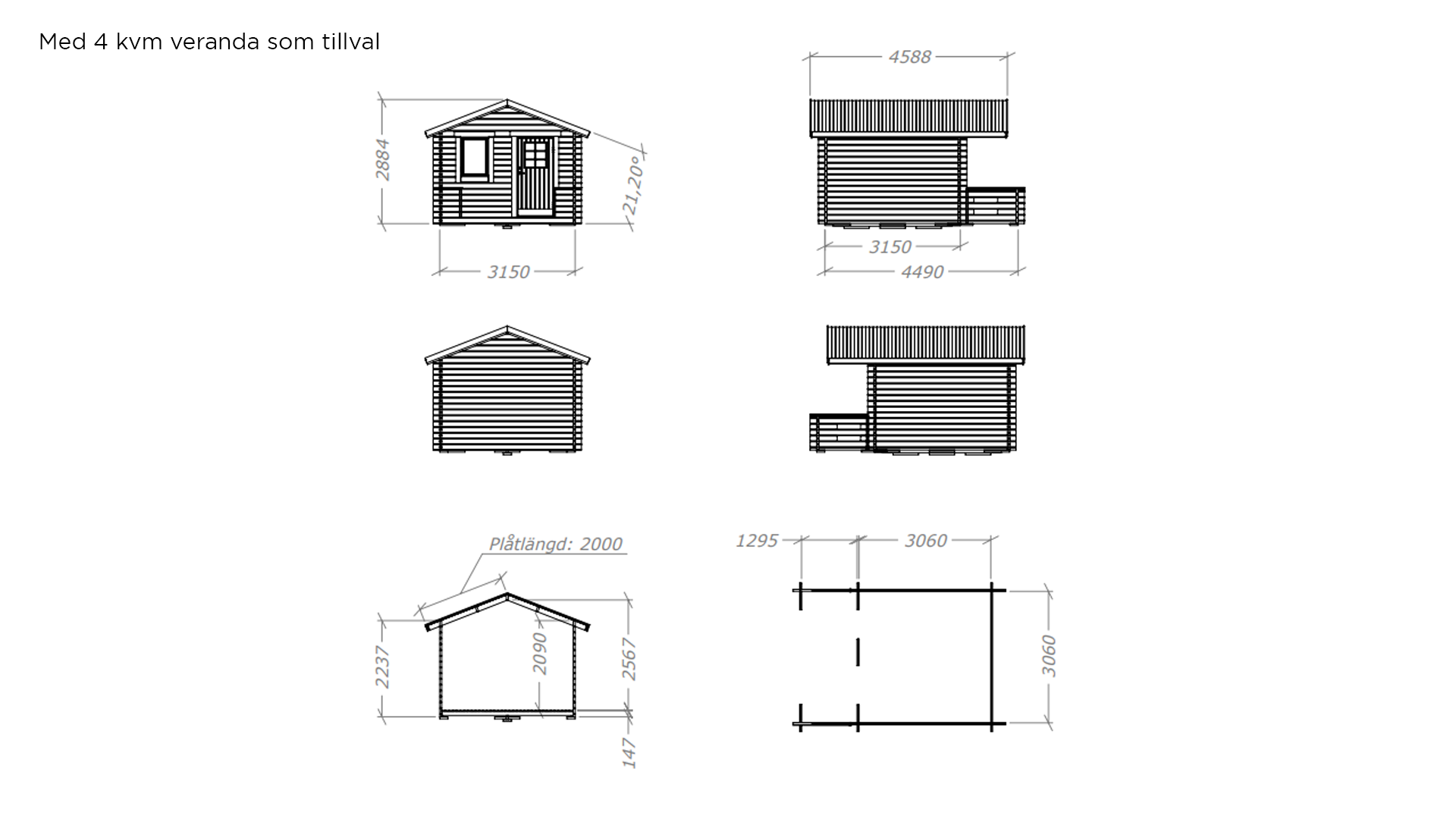 Yttre takbeklädnad (takshingelpaket finns som tillbehör) Handtag och låscylinder (finns som tillbehör) Spröjs till fönster (finns som tillbehör) Skruvsats (finns som tillbehör) Veranda 4m² (finns som tillbehör)