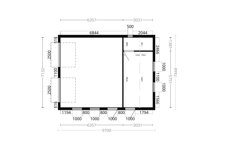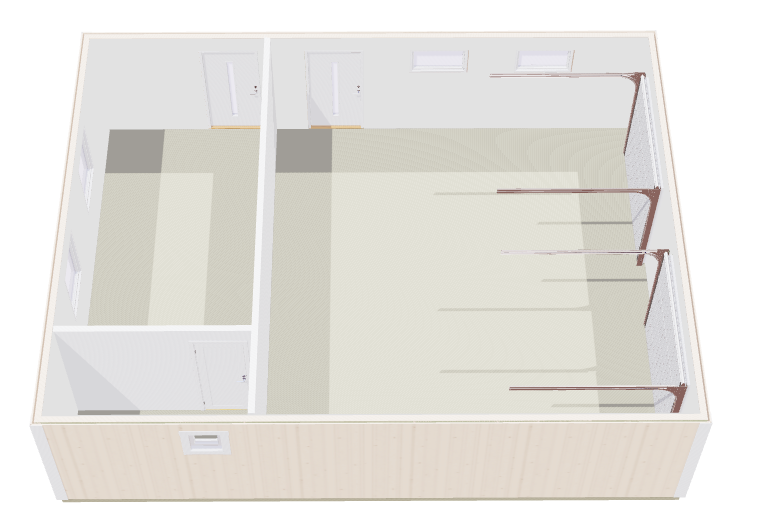 HUSKONFIGURATION - 1.0.9732867 ═══════════════════════════════════════════════════════════════ BYGGNAD: • Storlek: 7444×9700mm (72.21m²) • Total byggarea: 7444mm x 9700mm (72.21m²) • Vägghöjd - Väggpanel: 2.387m • Taktyp: Fackverktakstol () • Takfärg: ingen • Takavvattning: Nej • Färg vägg: Obehandlad • Färg Vindskivor och foder: Grundmålad vit TEKNISKA SPECIFIKATIONER: • Takvinkel: 22° • Nockhöjd: 4.190m • Nocklängd: 10.680m • Längd Taknock till takfot: 4.519m • Undertak: Undertak med kondensduk & läkt ISOLERING: • Tak: 145mm • Vägg: 95.00mm OSB: • Tak m²: 71.78 • Vägg m²: 130.86 INNERVÄGG: Storlek m²: 24.39 Dörr: 1x Innerdörr 8x21 Tillbehör: MODULER (33 st totalt): • 2X Modul Takskjutport Hörmann 21x25 - m30 • 2X Modul h4v • 9X Modul m6 • 2X Modul h4h • 16X Modul m12 • 2X Modul m9 • 2X Modul Ytterdörr med smalt fönster 10x21 - m12 • 2X Modul h4v • 9X Modul m6 • 2X Modul h4h • 2X Modul m9 • 2X Modul 10x6 2-glasfönster överhängt - m12 • 2X Modul h4v • 9X Modul m6 • 2X Modul h4h • 2X Modul m9 • 2X Modul 10x12 3-glasfönster 1-luft vridfönster - m12 • 2X Modul h4v • 9X Modul m6 • 2X Modul h4h • 2X Modul m9 • 1X Modul 5x5 2-glasfönster sidohängt - m12 • 2X Modul h4v • 9X Modul m6 • 2X Modul h4h • 2X Modul m9 • 2X Modul h4v • 9X Modul m6 • 2X Modul h4h • 2X Modul m9